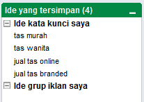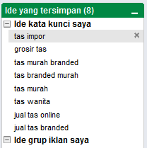• Dari gambar di atas anda bisa melihat saya menandai dengan dua kolom biru dan merah. Biru memperlihatkan variasi dari kata “jual tas”, sedangkan merah memperlihatkan kata kunci lain yang harus kita coba.