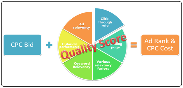 The figure below identifies the main factors affecting the quality score of your ad. The most important ones are the Clickthrough rate, the CPC bid, the ad relevancy, the keyword relevancy, the landing page optimization, the historical performance of the ad and other relevancy factors associated with your geographic target location and target devices.