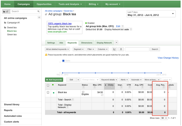 2- Determine your ad position by looking at the Avg. Pos column in the statistics table. This column displays the average position of your ad. Please see the screenshot below to better understand where you can find the average position column.
