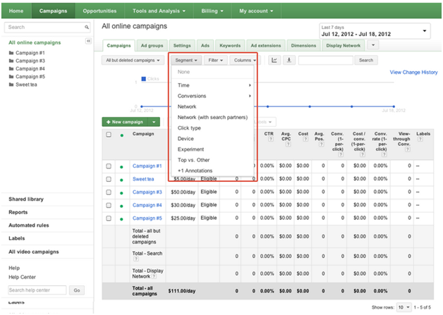 3-      Click on campaigns, ad groups or ads and move to the segment button displayed at the top.