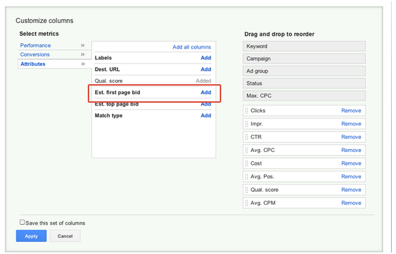 3- Move to the attributes drop down menu and add estimated top page bid. This is the bid required for your ad to display regularly in the top positions. (Provided the other factors like ad relevancy and ad performance history favor your ad score).
